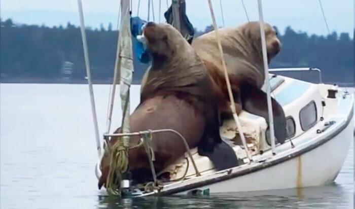 När de kom närmare såg de att båten kapats av två enorma sjölejon som låg och vilade på däck. Sjölejon är inga lättviktare och när hela ”besättningen” hade sträckt ut sig i båtens för såg det ut som att båten var nära att sjunka.