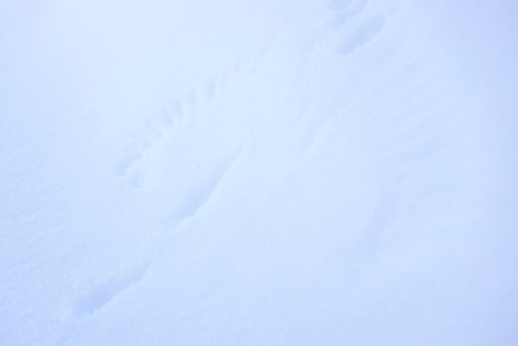 Sedan är vi nöjda och går vidare. Vi ser ett spännande avtryck i snön från en fågel som flaxat till och lyft. Sonen blir förtjust; det är inte ofta man ser sådana konstnärliga märken i snön.