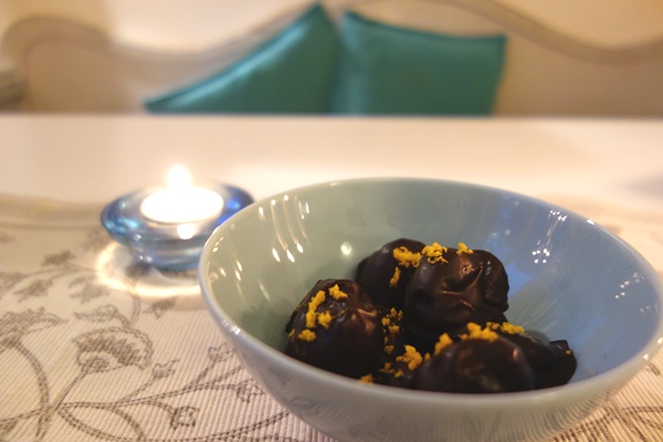 Lägg de färdiga bollarna på ett bakplåtspapper på en bricka eller tallrik. Lägg lite rivet apelsinskal ovanpå och ställ in i kylen för att stelna.