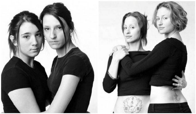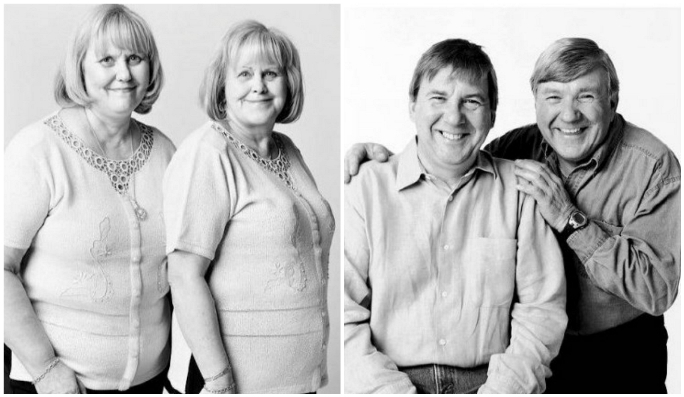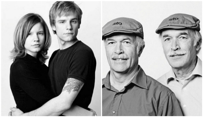 Till höger syns Edith Préfontaine and Stéfanie Tremblay: Fotografen François Brunelle sade: ”Jag blev med en gång förbluffad av deras likhet, samma energi, samma hår, samma glasögon och de var också klädda på samma sätt! Jag var tvungen att introducera dem för varandra och de enades omedelbart om hur mycket de liknade varandra”.