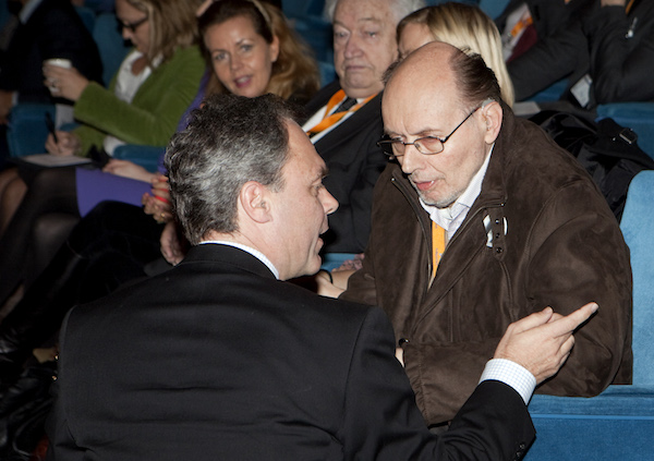 Jan Björklund (L) och Per Ahlmark samtalar på Folkpartiets riksmöte i Västerås 2012, ett av Ahlmarks sista större publika framträdanden. Foto: Per Groth