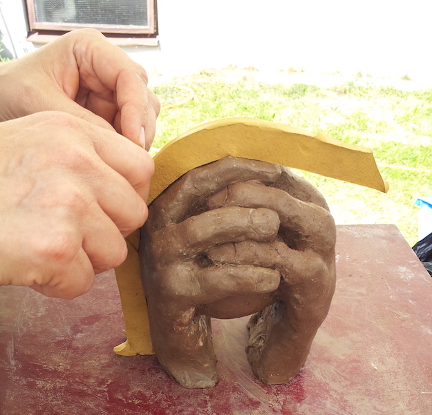 Händerna uppbyggda i lera. Här har jag börjat ta form för att göra en gjutform i gips som jag gjuter betong inuti. Foto: Anton Nilsson