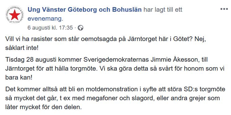 ”Tisdag 28 augusti kommer Sverigedemokraternas Jimmie Åkesson, till Järntorget för att hålla torgmöte. Vi ska göra detta så svårt för honom som vi bara kan!”, skriver Ung Vänster i Facebook-inlägget.