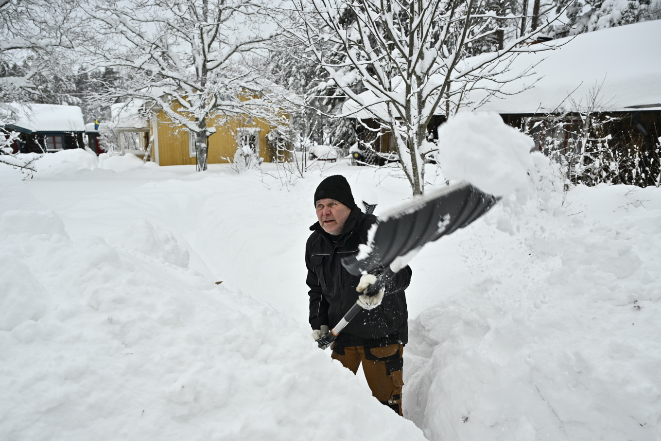 Nils Lindmark bor i Gävle men har ett sommarhus i byn Råhällan mellan Gävle och Ockelbo. Han har åkt dit för att titta till huset och skotta snö efter de senaste dagarnas oväder. Foto: Anders Wiklund/TT