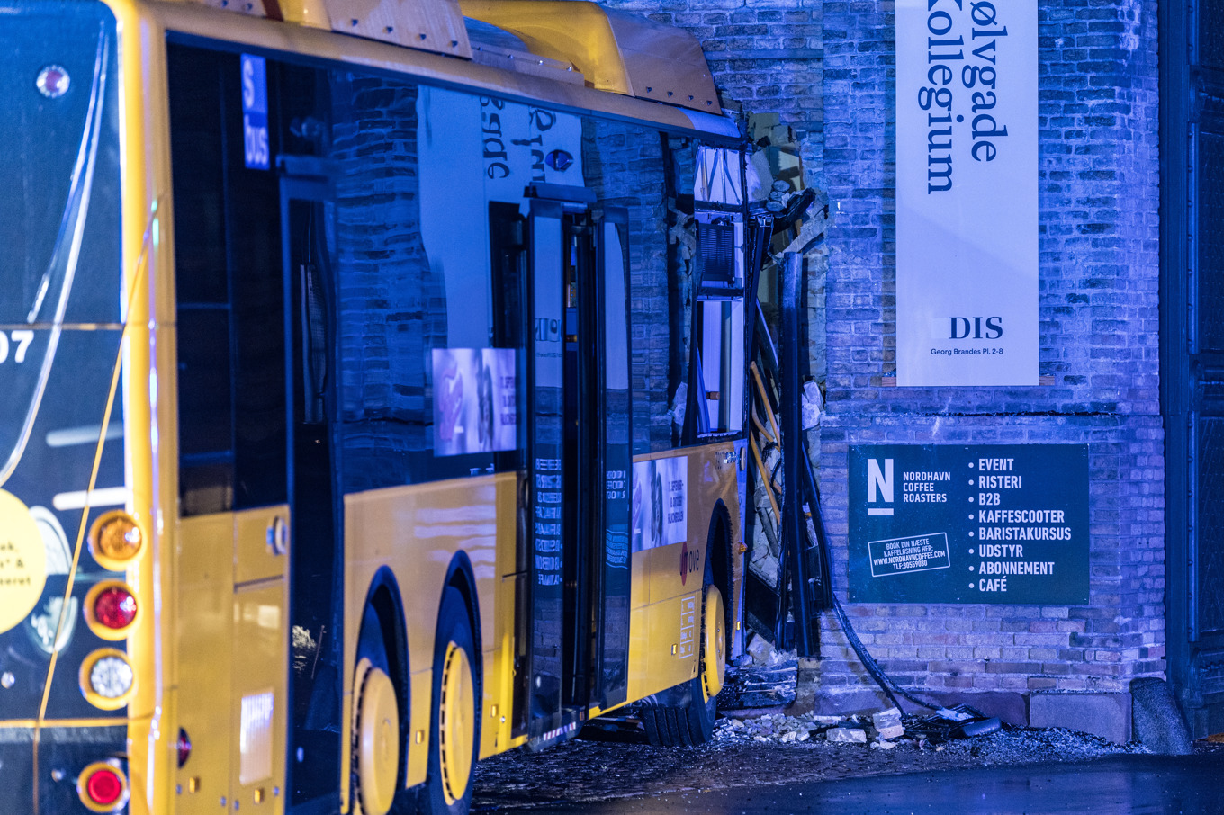 Vid lunchtid sitter bussen fortfarande fast i väggen. Eftersom byggnadens fasad riskerar att rasa går den inte att flytta på. Huset har tidigare använts som huvudkontor för järnvägsbolaget DSB, men sedan 2016 rymmer huset bland annat studentbostäder. I just den delen av huset som bussen kört in i finns inga bostäder och därför har ingen evakuering beordrats, enligt polisen.