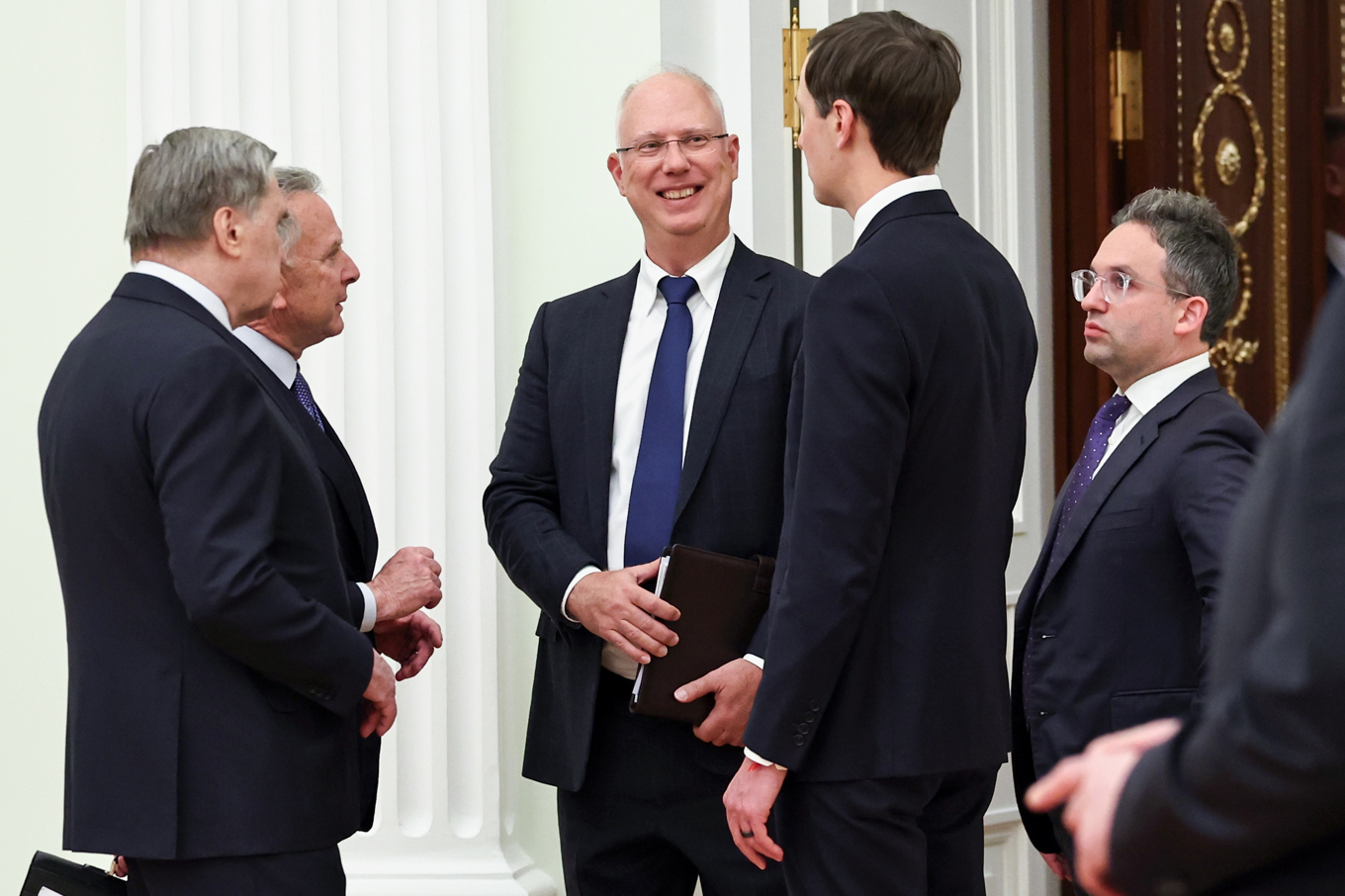 Möte i Moskva den 22 januari. USA:s sändebud Steven Witkoff, tvåa från vänster, och president Trumps svärson Jared Kushner, tvåa från höger, träffade bland andra den ryske förhandlaren Kirill Dmitrijev, mitten, och president Putins rådgivare Jurij Usjakov, vänster. Foto: Alexander Kazakov/Sputnik/Kreml/poolfoto via/AP/TT