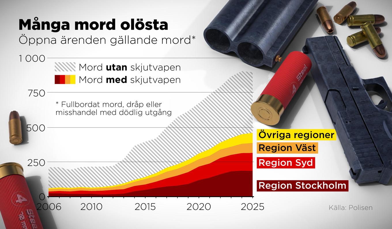 Vid utgången av 2025 hade Sverige 459 öppna utredningar om skjutvapenmord, enligt statistik från polisen. Flest öppna ärenden finns kanske inte förvånande i den största regionen, Stockholm, följt av region Syd.