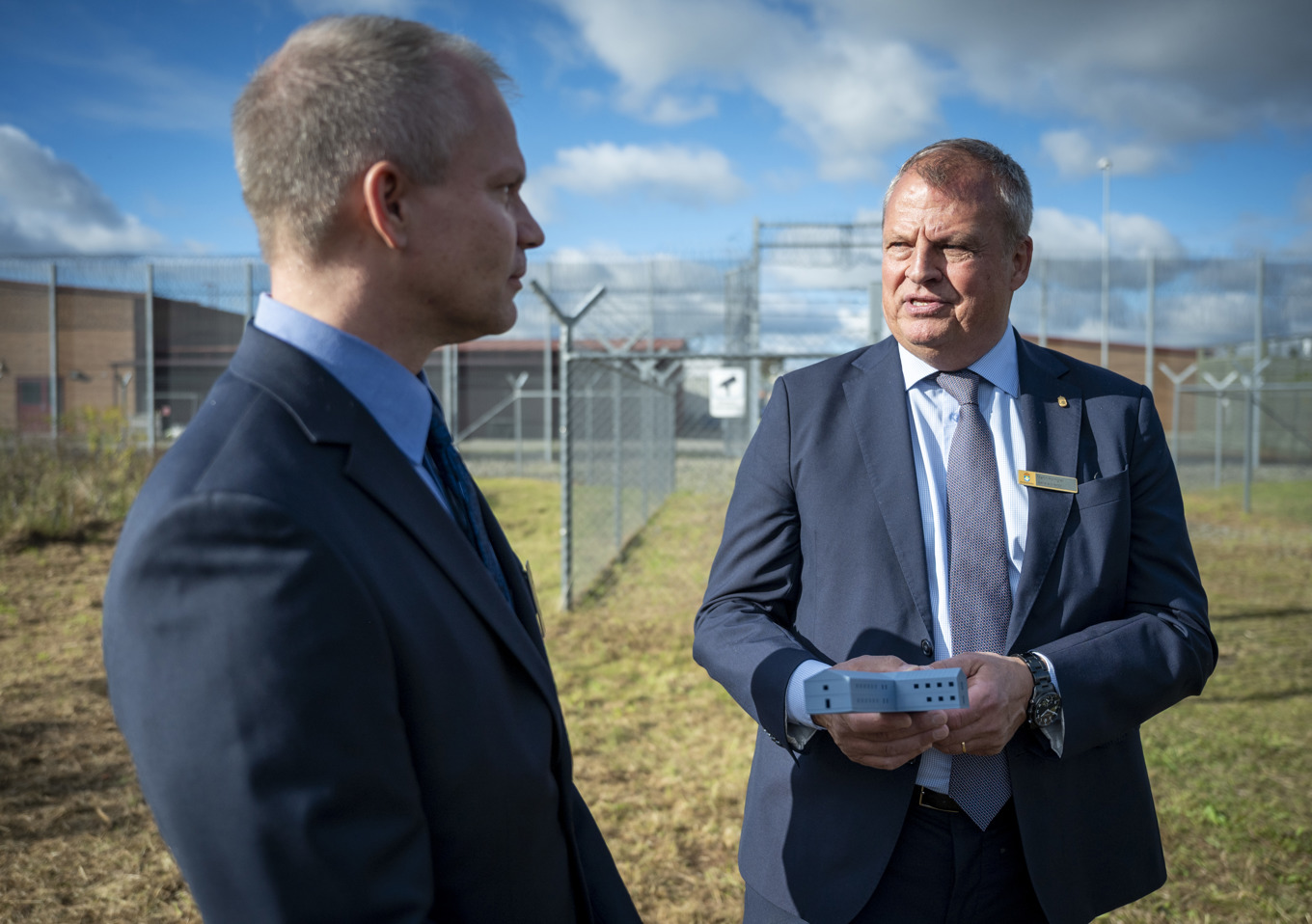 Anders Jansson, kriminalvårdschef i Ystad, och Martin Holmgren, generaldirektör för Kriminalvården, med en modell för den fängelsebyggnad som byggas utanför kvinnofängelset och häktet i Ystad. Foto: Johan Nilsson/TT