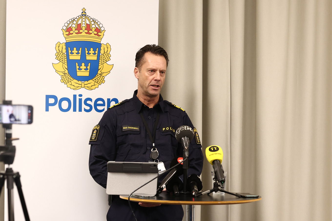 Max Åkerwall, biträdande polisområdeschef i Stockholm syd i samband med dagens pressträff. Foto: Nils Petter Nilsson/TT