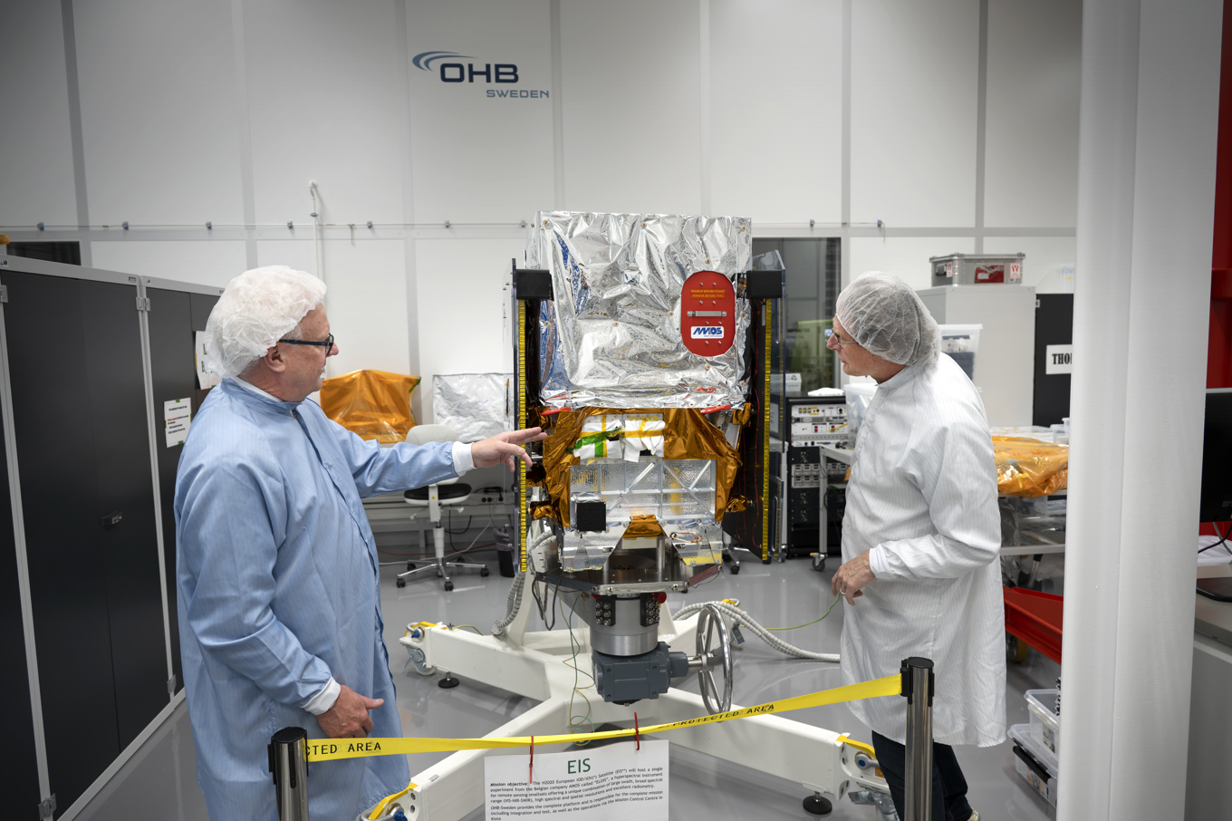 OHB Swedens vd Fredrik Sjöberg och Joakim Kugelberg framför satelliten EIS som görs för ESA. Foto: Anders Wiklund/TT