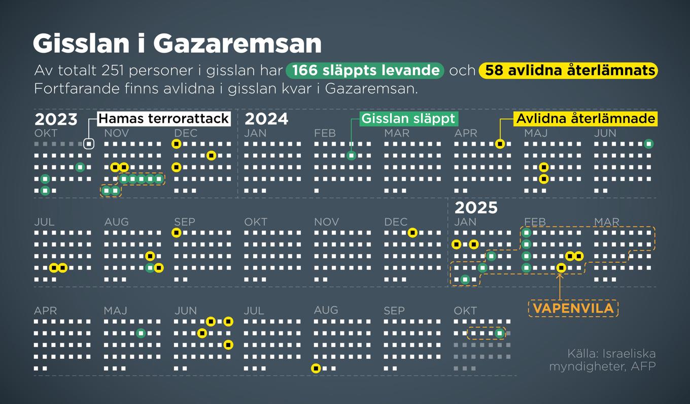 Av totalt 251 personer i Hamas gisslan har 166 släppts levande. Kvarlevorna efter 58 avlidna har återlämnats. Fortfarande finns avlidna i gisslan kvar i Gazaremsan. Foto: Anders Humlebo/TT