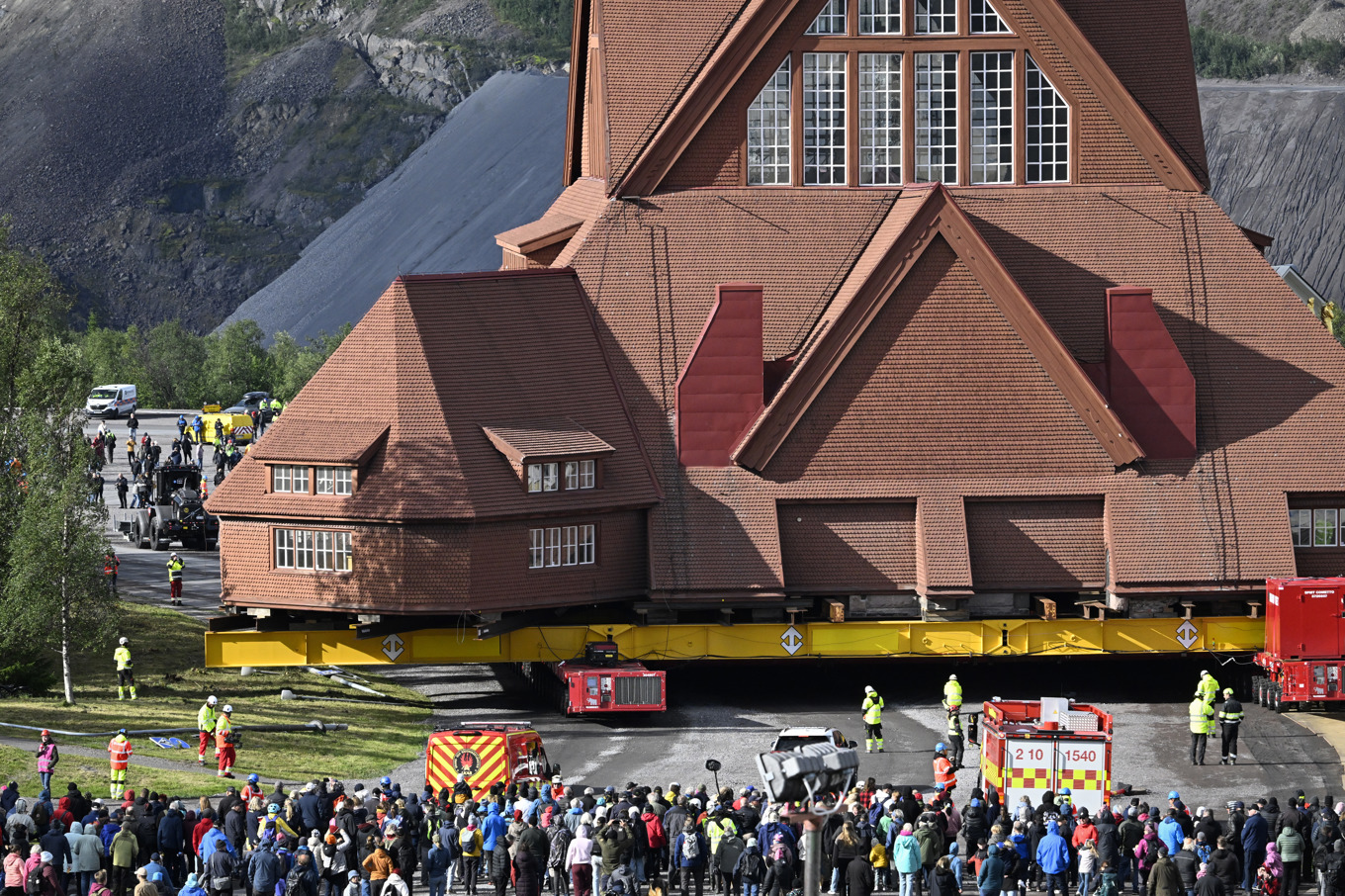 På en specialkonstruerad vagn med 224 hjul flyttas Kiruna kyrka med en maxhastighet av 500 meter i timmen. Kyrkans nya position blir vid nya Kiruna centrum. Foto: Fredrik Sandberg/TT