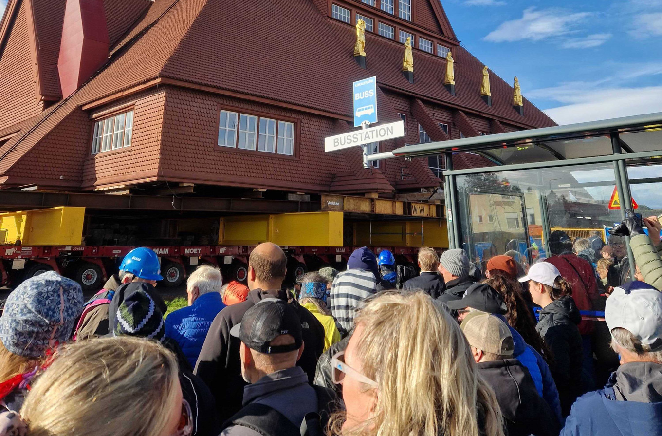 Strax efter klockan åtta på tisdagsmorgonen började det gigantiska flyttlasset rulla, knappt märkbart. Den 40 gånger 40 meter stora och 672 ton tunga kyrkan står på en trailer med 224 hjul.