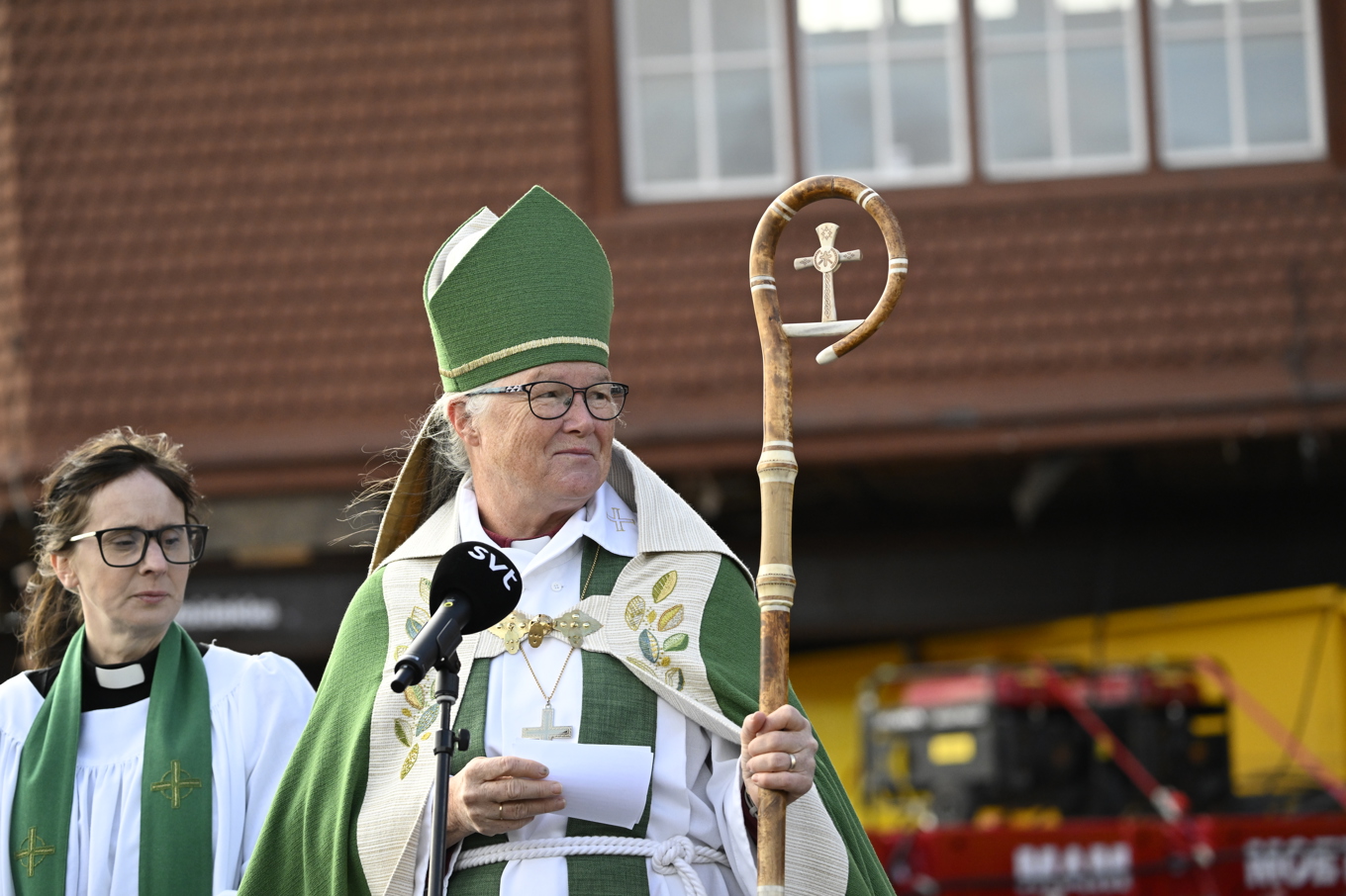 Åsa Nyström, biskop i Luleå stift, och bakom henne kyrkoherde Lena Tjärnberg som tillsammans välsignade kyrkan och dess färd. Foto: Fredrik Sandberg/TT
