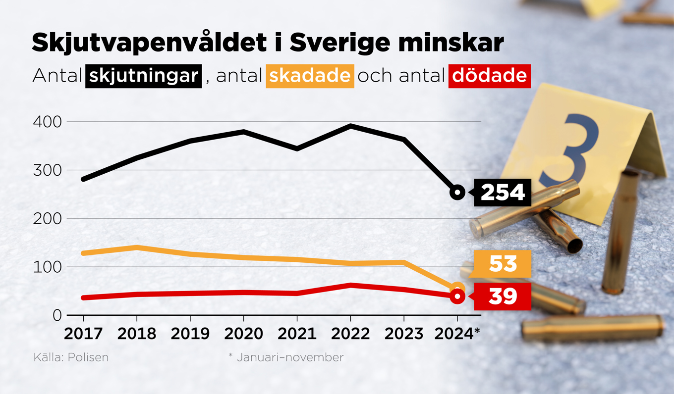Skjutvapenvåldet i Sverige minskade kraftigt under 2024. Skjutningarna är långt färre än tidigare och antalet skottskadade har halverats.