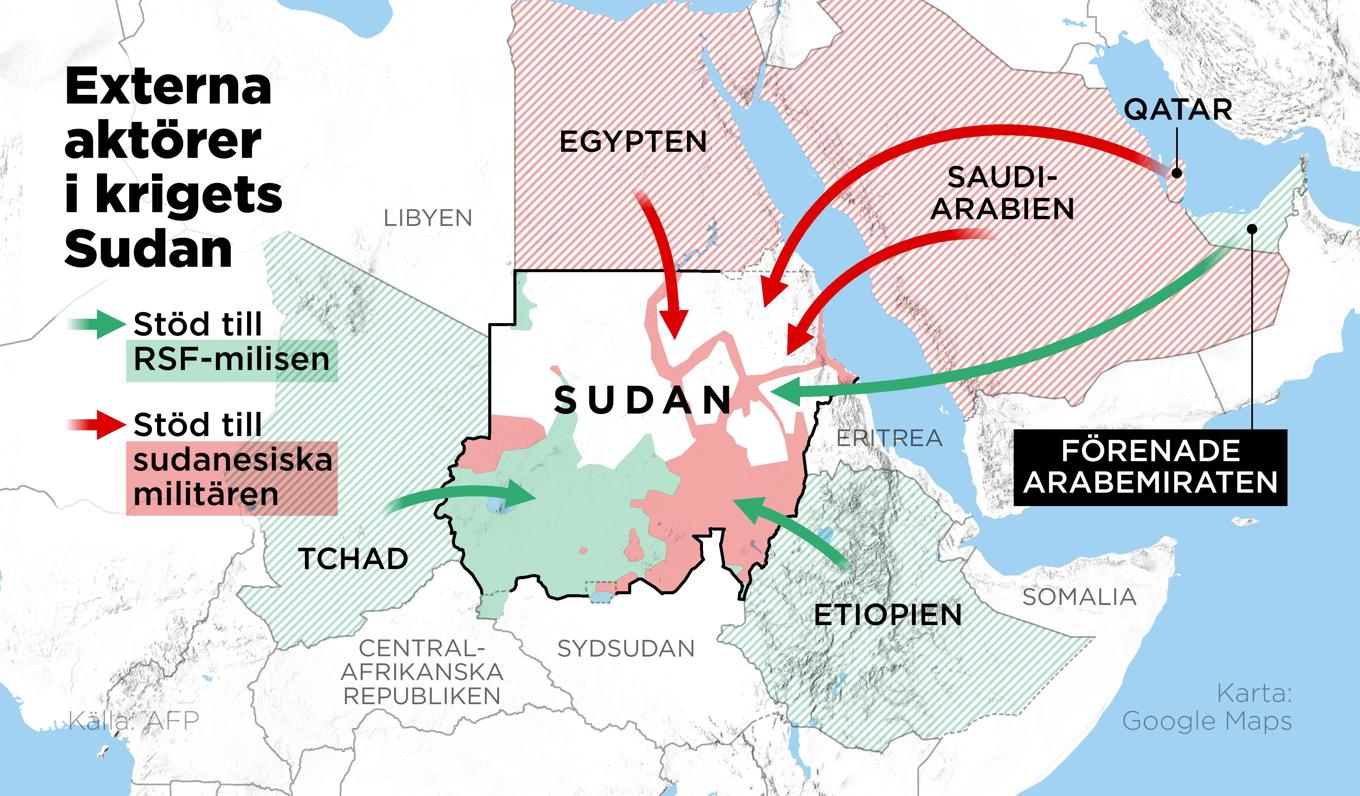 Landet stöttar de väpnade RSF-styrkorna som har ursprung i arabmiliserna janjawid – som under diktatorn Omar al-Bashir goda minne dödade hundratusentals människor i Darfur på 00-talet i vad många bedömare liknat vid ett folkmord.