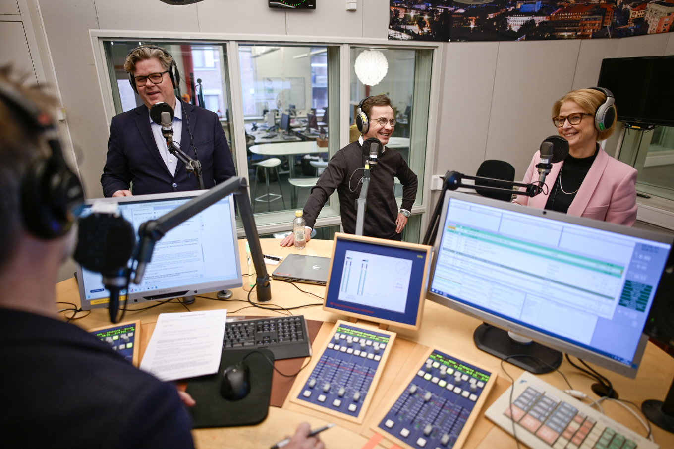 Ulf Kristersson, finansminister Elisabeth Svantesson och justitieminister Gunnar Strömmer intervjuas av P4 Uppland. Foto: Magnus Lejhall/TT