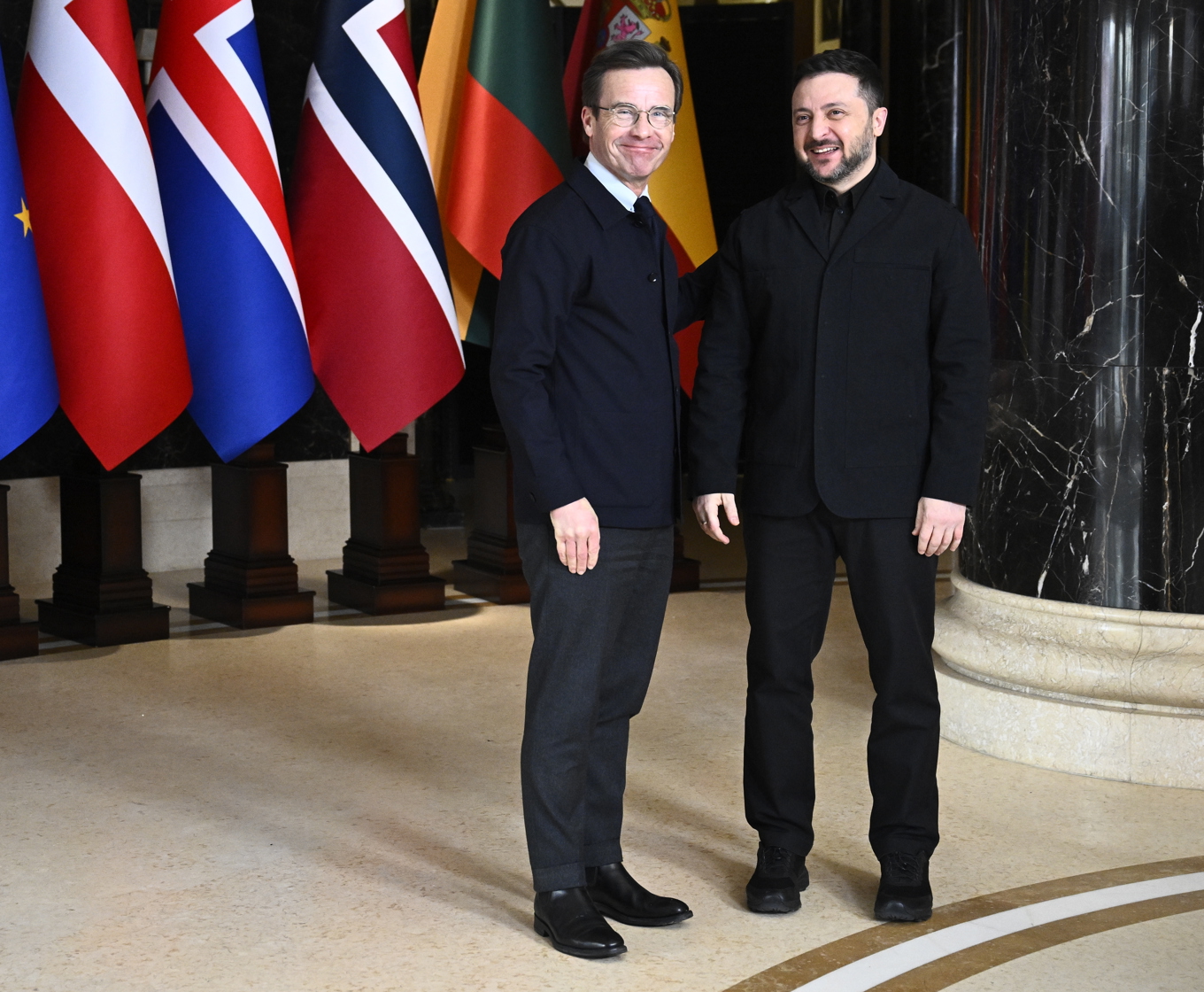 Statsminister Ulf Kristersson med president Zelenskyj i Kiev med anledning av att flera ledare är på plats för ceremoni och högtidlighållande av fyraårsdagen av Rysslands fullskaliga invasion av Ukraina. Foto: Fredrik Sandberg/TT