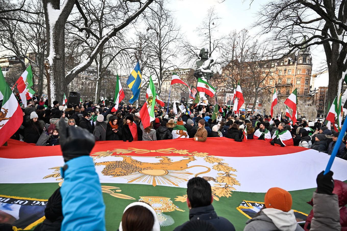 Reza Pahlavi lyfts fram som en rättmätig kung av Iran som del av motivet på den stora flaggan. Demonstrationen hölls i centrala Stockholm i helgen. Foto: Christine Olsson/TT