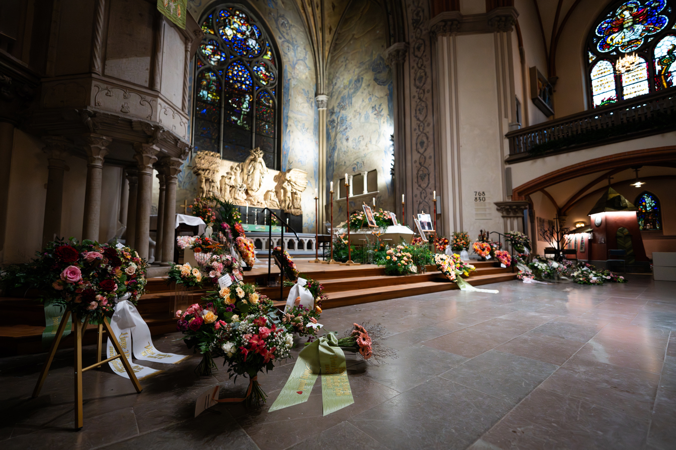 På och omkring kistan var det fullt av blomsterarrangemang och kransar, vissa formade som hjärtan. Flera bilder på My var uppställda.