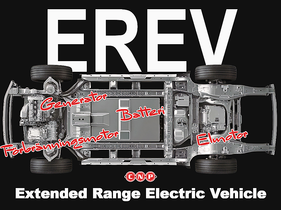EREV står för ”Extended Range Electric Vehicle” och är en elbil som kompletteras med en bensindriven räckviddsförlängare. Vips kan man ta sig närmare 140 mil utan att stanna för att tanka eller ladda batterierna. En liten avgasrenad förbränningsmotor har som enda uppgift att fungera som generator och underhållsladda batterierna. Motorn driver alltså aldrig hjulen, och drar därmed minimalt med soppa.