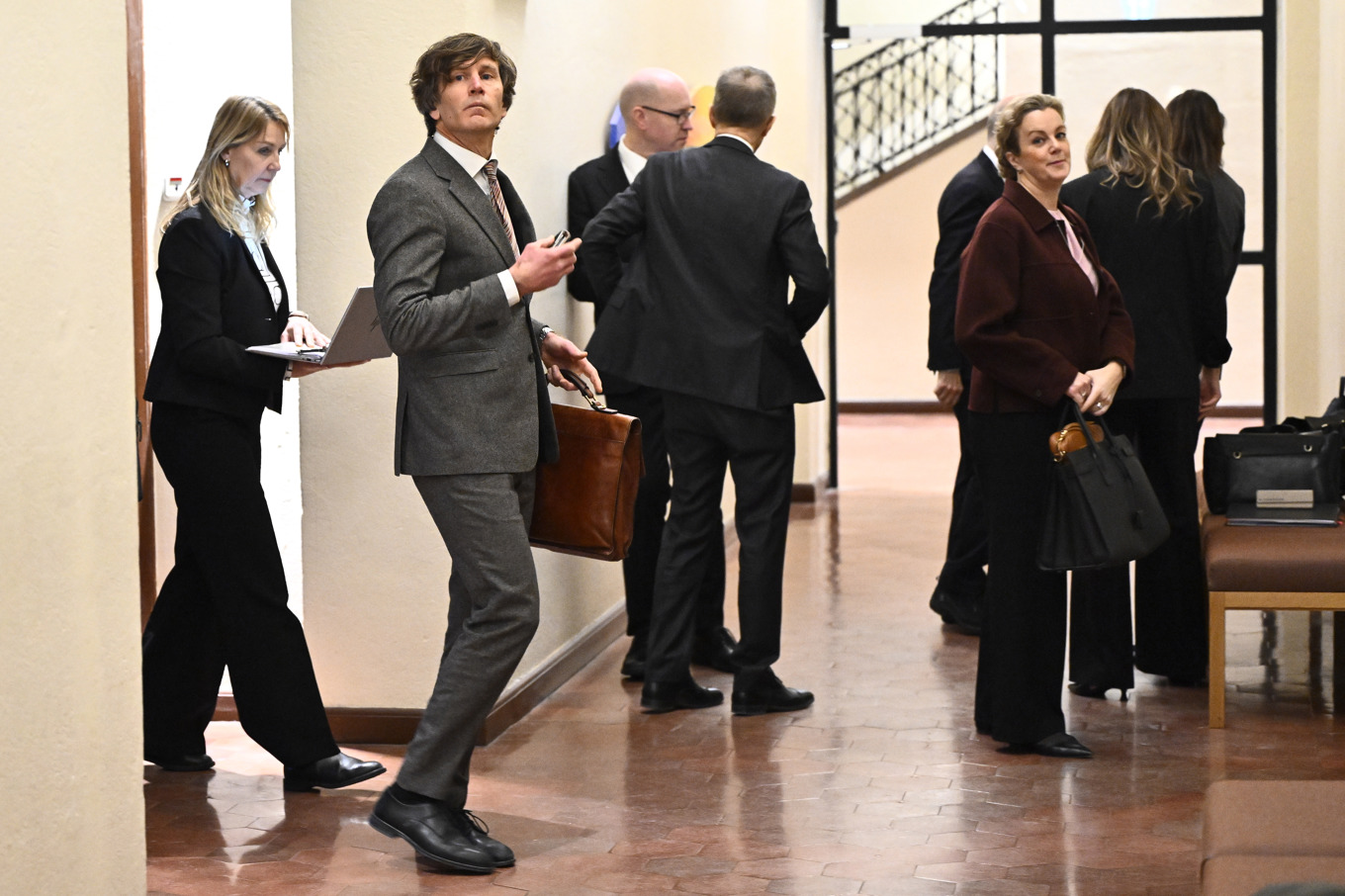 Åklagare Henrik Attorps (med grå kostym) i Stockholms tingsrätt tidigare under förhandlingen. Foto: Henrik Montgomery/TT
