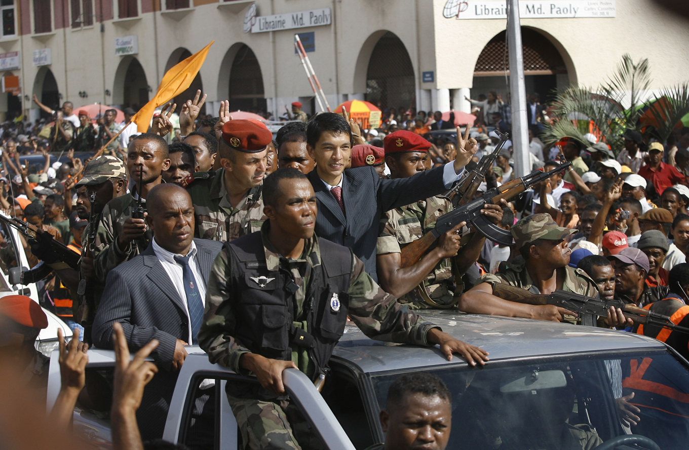 Den dåvarande oppositionsledaren Andry Rajoelina (mitten) gör segertecken när han paraderar genom huvudstaden Antananarivo efter att ha tagit makten i mars 2009. Foto: Jerome Delay/AP/TT