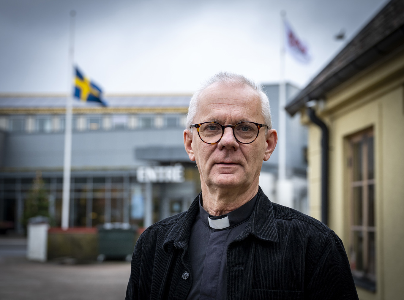Kyrkoherde Olof Sandström utanför församlingshemmet i Hörby på onsdagen efter tisdagens misstänkta dubbelmord. Foto: Johan Nilsson/TT