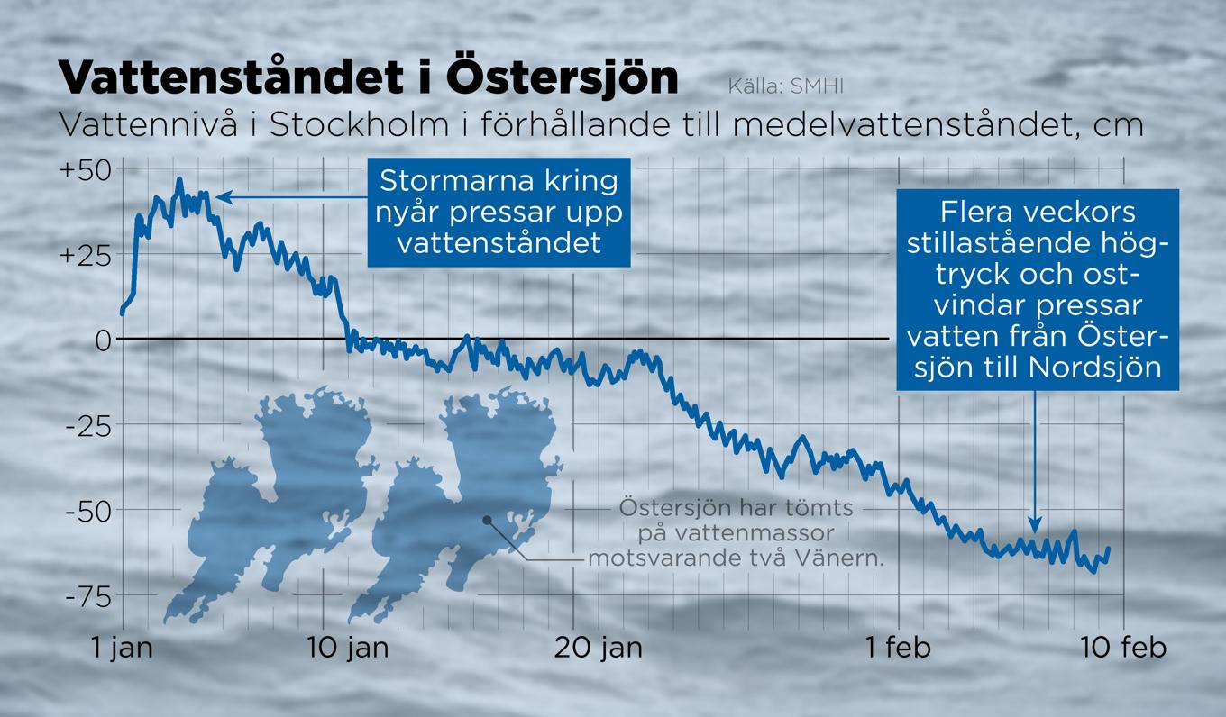 Vattennivå i Stockholm i förhållande till medelvattenståndet, skillnad i centimeter. Foto: Anders Humlebo/TT
