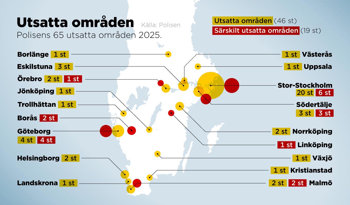 Ett område tillkommer och ett försvinner i polisens lägesbild över så kallade utsatta områden i Sverige. Det finns nu 65 utsatta områden i landet varav 19 bedöms vara särskilt utsatta.