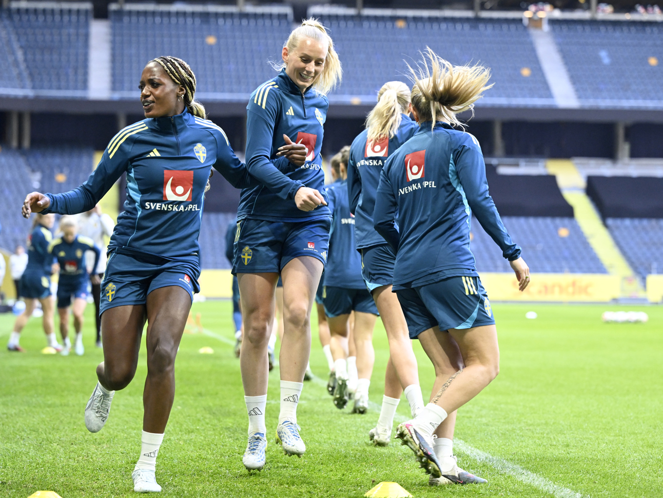 Evelyn Ijeh och Stina Blackstenius under fredagens träning på Strawberry arena i Solna, inför lördagens VM-kvalmatch mot Serbien. Foto: Jessica Gow/TT