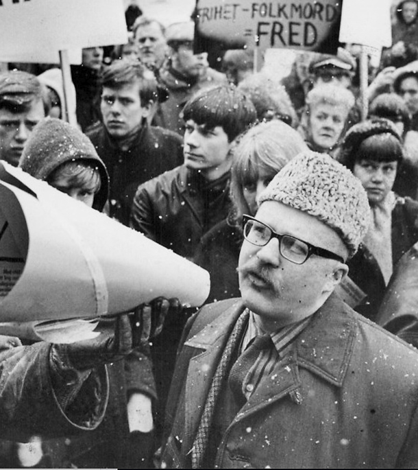 Året är 1966 och Jan Myrdal deltar i en demonstration mot Vietnamkriget på Medborgarplatsen i Stockholm. Fotograf okänd. Foto: Wikimedia Commons