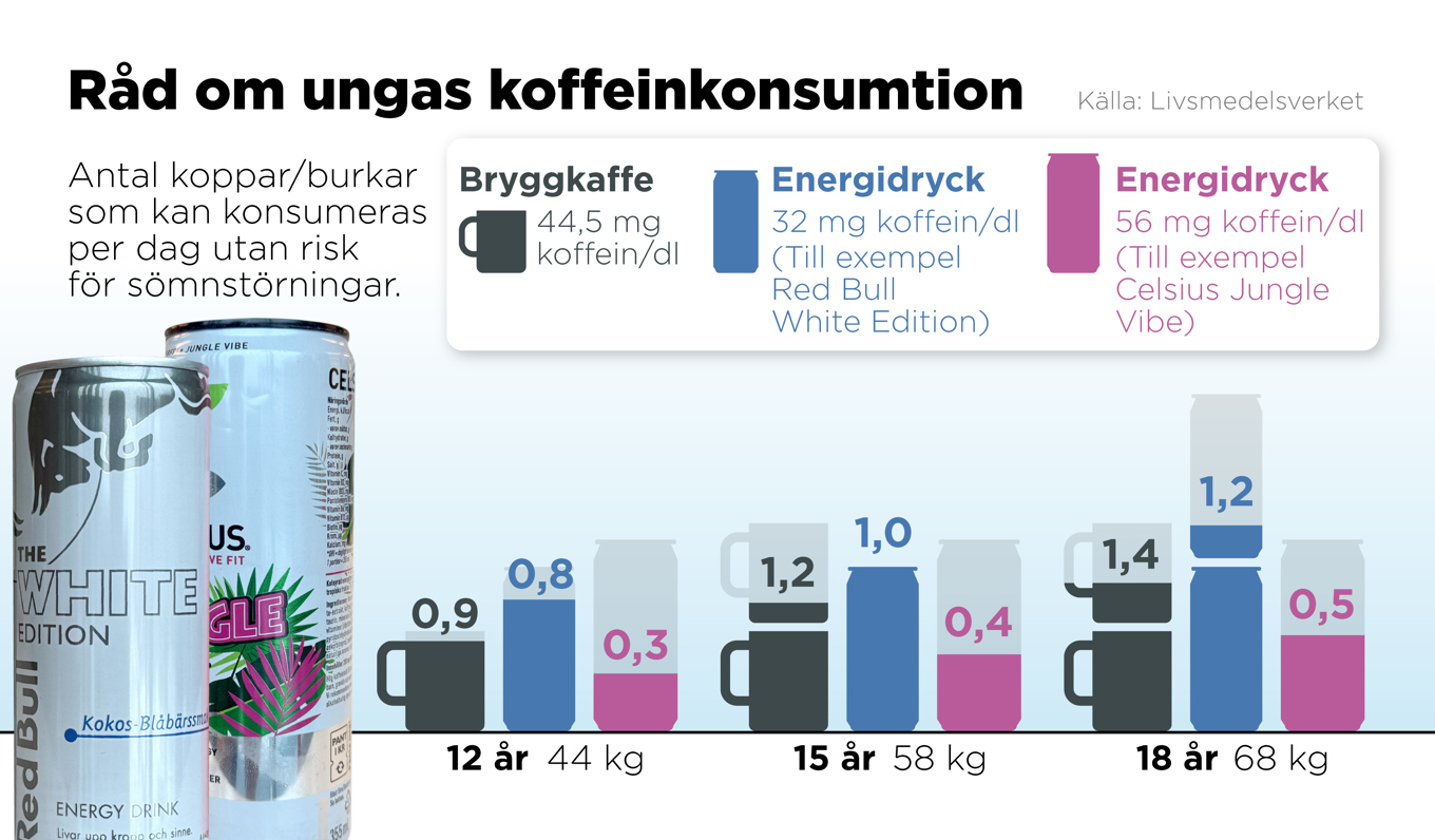 Koffeinkonsumtion har blivit vanligare bland unga. Enligt Livsmedelsverket fördubblades konsumtionen av energidrycker hos svenska ungdomar mellan åren 2018 och 2023. Nu föreslår Livsmedelsverket nya råd om ungas konsumtion.