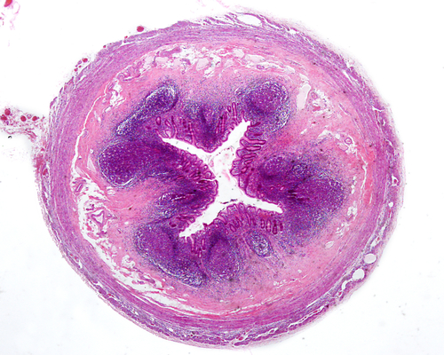 - Blindtarm. Tvärsnitt av en människas blindtarm sett genom ett ljusmikroskop med liten förstoring. (Shutterstock)