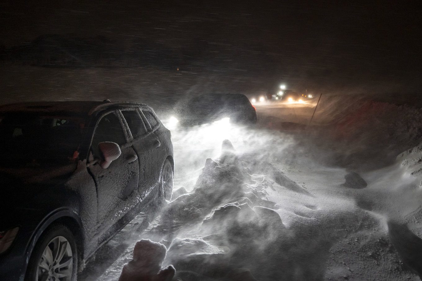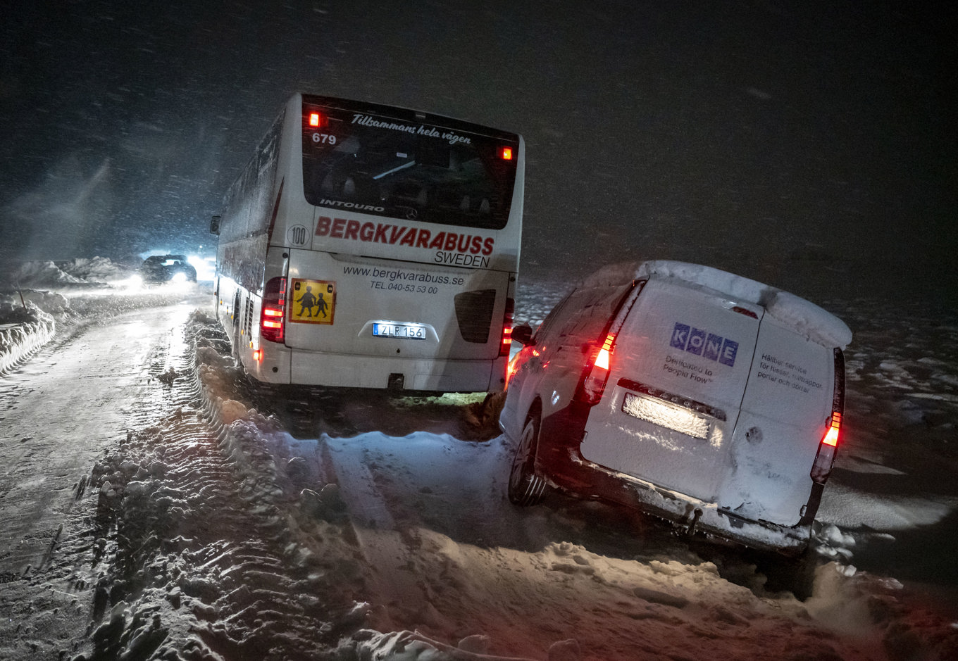 På E6 utanför Landskrona står en mängd fordon stilla på grund av snöovädret. Räddningstjänsten är på plats med bandvagnar för att evakuera dem som behöver hjälp. Även delar av E22 är avstängda i Skåne.