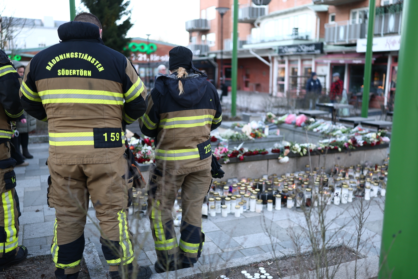 Personal ur räddningstjänsten lämnar en bukett vid minnesplatsen. Foto: Nils Petter Nilsson/TT