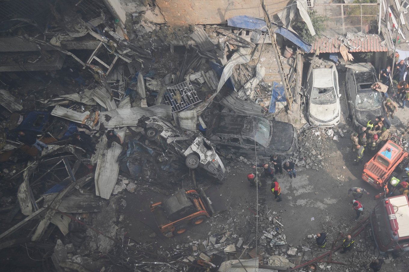 Räddningspersonal vid ett bostadshus i Beirut som träffats i onsdagens kraftiga attacker. Foto: Hassan Ammar/AP/TT