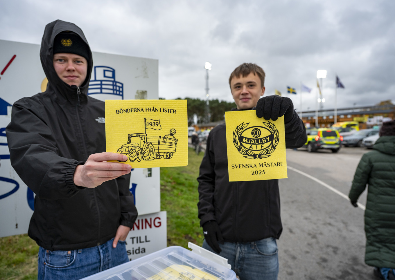 Mjällbyfans säljer SM-gulddisktrasor på Strandvallen. Foto: Johan Nilsson / TT