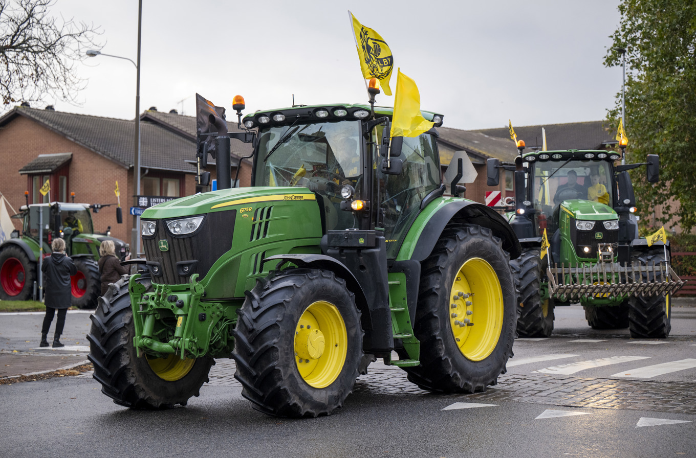 Traktorer med Mjällbyflaggor, som eskorterade spelarbussen i tisdags efter att SM-guldet säkrats. Foto: Johan Nilsson / TT