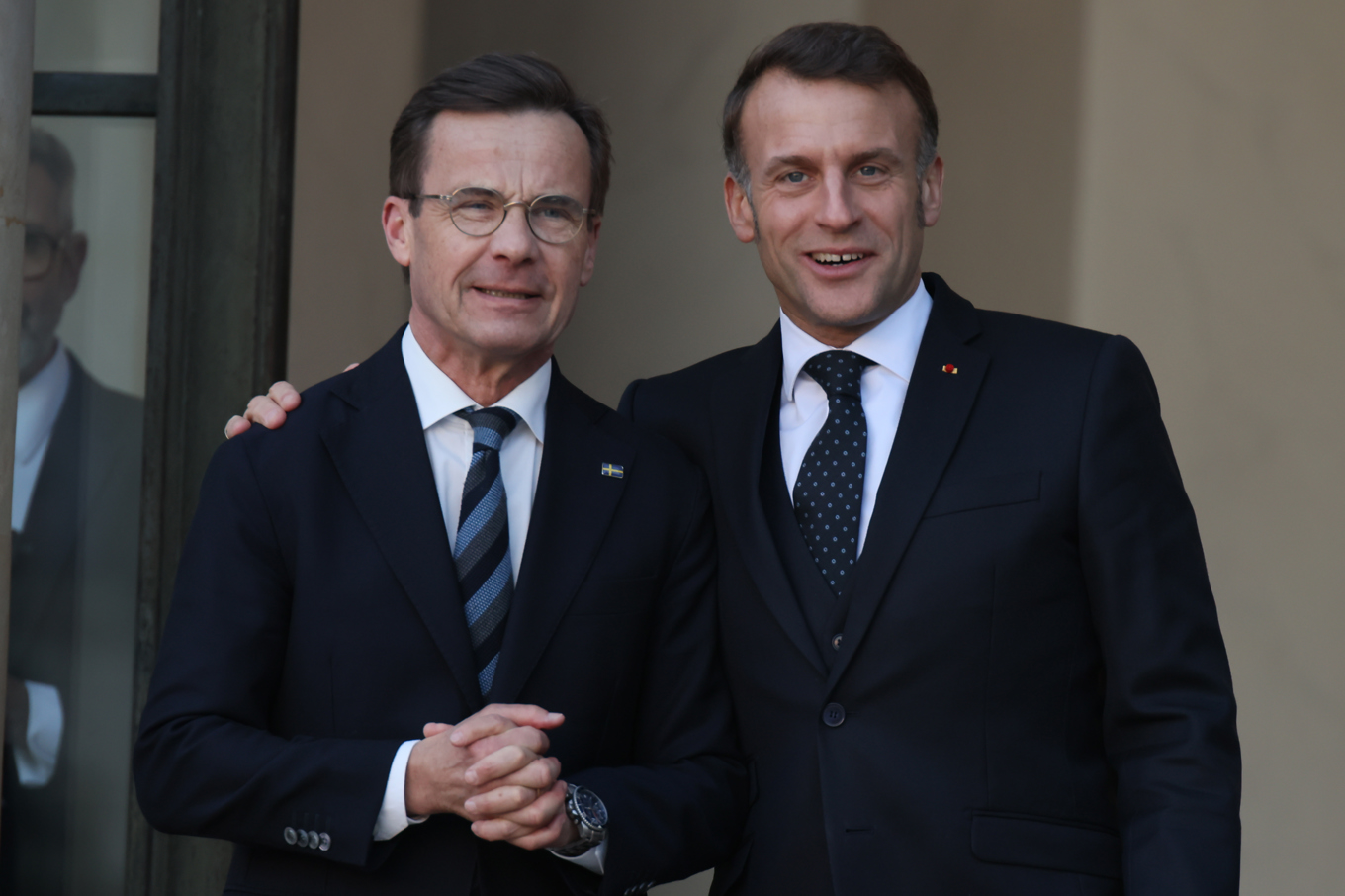 Statsminister Ulf Kristersson tillsammans med Frankrikes president Emmanuel Macron som stod värd för mötet i Paris. Foto: Thomas Padilla/AP/TT