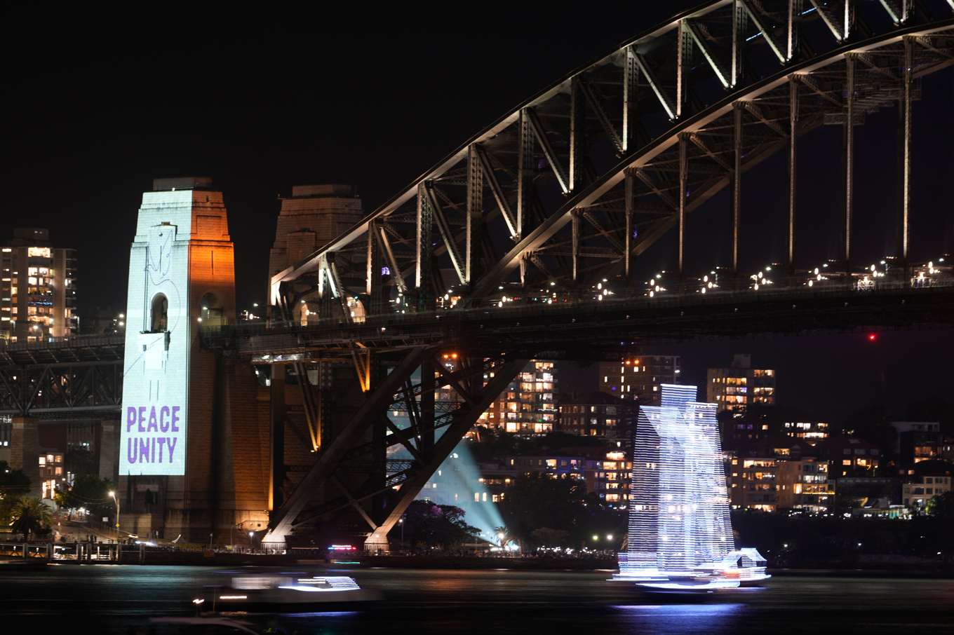 En projektion med orden "fred" och "enighet" visades i samband med att offren för det antisemitiska terrordådet vid Bondi Beach hedrades vid firandet i Sydney Harbour. Foto: Rick Rycroft/AP/TT