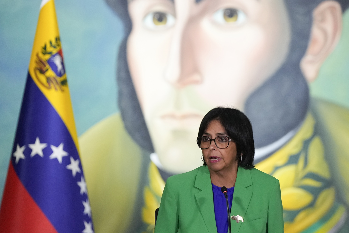 Delcy Rodríguez på ett möte i Caracas 2023, med revolutionshjälten Simón Bolívars porträtt i bakgrunden. Foto: Matias Delacroix/AP/TT