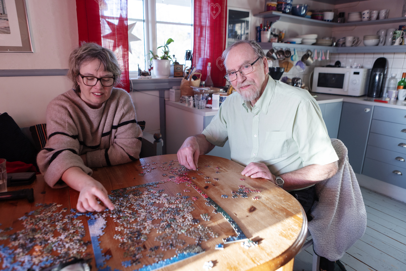 Line Rudvall och Kalle Frid har varit strömlösa i snart ett dygn efter stormen Johannes framfart med hårda vindar. De har roat sig med att lägga pussel. Foto: Ida Frid / TT