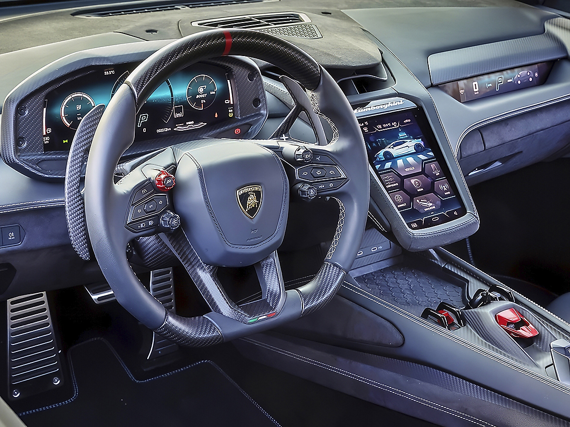 Själva modellnamnet Temerario är däremot inget mysterium utan följer gammal god tradition och kommer från en hänsynslös tjur som satte skräck i matadorerna år 1875. Det råder heller ingen tvekan om att det är en Lamborghini – formspråket är rent, skarpt och helt befriat från överdrivna linjer. Testbilen vi tilldelats är förvisso lackerad i den skrikiga kulören Verde Mercurius, men i övrigt är designen förhållandevis återhållsam för att ha sitt ursprung i Sant’Agata Bolognese. Detsamma gäller interiören, som bjuder på bättre utrymmen och inte minst ett betydligt lättare insteg. Ursäkta, men det är nästan så att man saknar tiden då själva entrén var ett eget litet cirkusnummer som satte byxsömmarna på prov. På tal om sömmar så är hela den handgjorda inredningen ett mästerverk i sig, och de skålade sportstolarna kallas komfortstolar av Lamborghini. Ferruccio lär vända sig i sin grav.