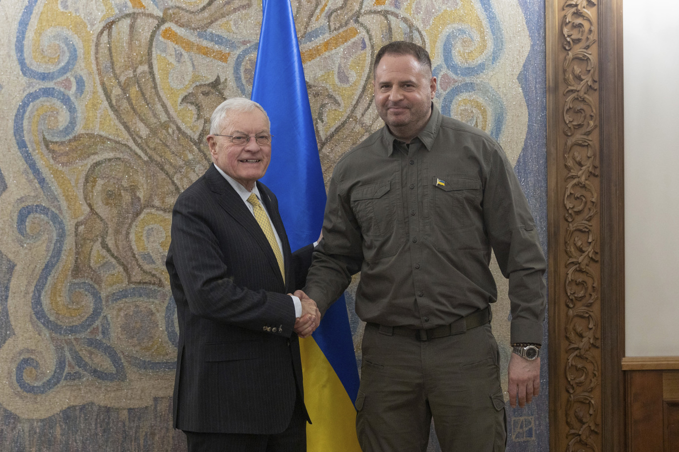 Andrij Jermak, till höger, tillsammans med USA:s sändebud Keith Kellogg vid ett möte i Kiev i februari i år. Foto: Ukrainas presidentstab via AP/TT